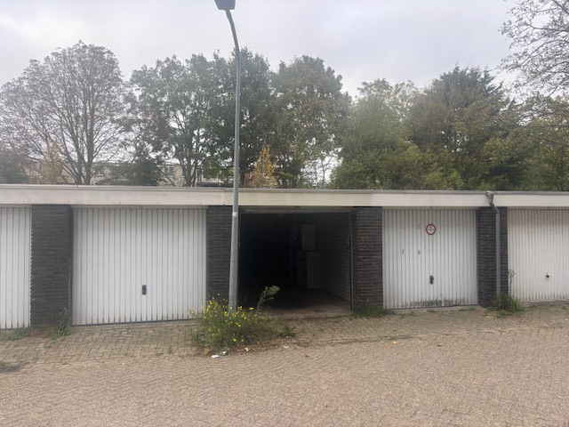 Ruime garagebox voor stalling van een auto of als extra opslagruimte. De garagebox heeft gemetselde gevels, een plat dak en een stalen kanteldeur.